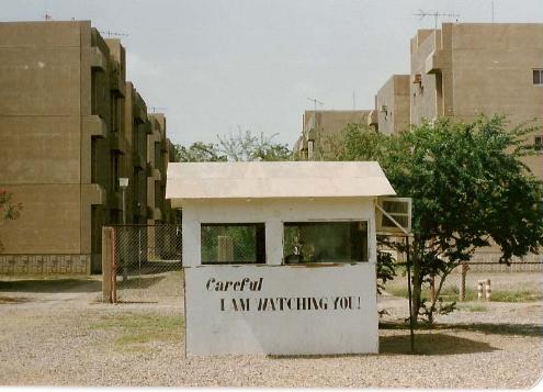 Next to the gatehouse is a large billboard bearing the words “YOU ARE BEING